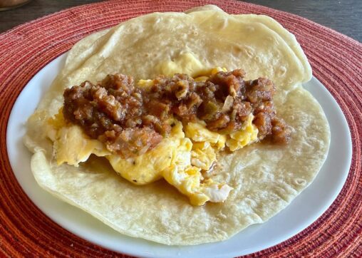 My wife made some tacos for breakfast today. Scrambled eggs. Tortillas. Salsa. Simplicity. The flour tortillas are from the HEB Bakery and they are really good. Warm them…