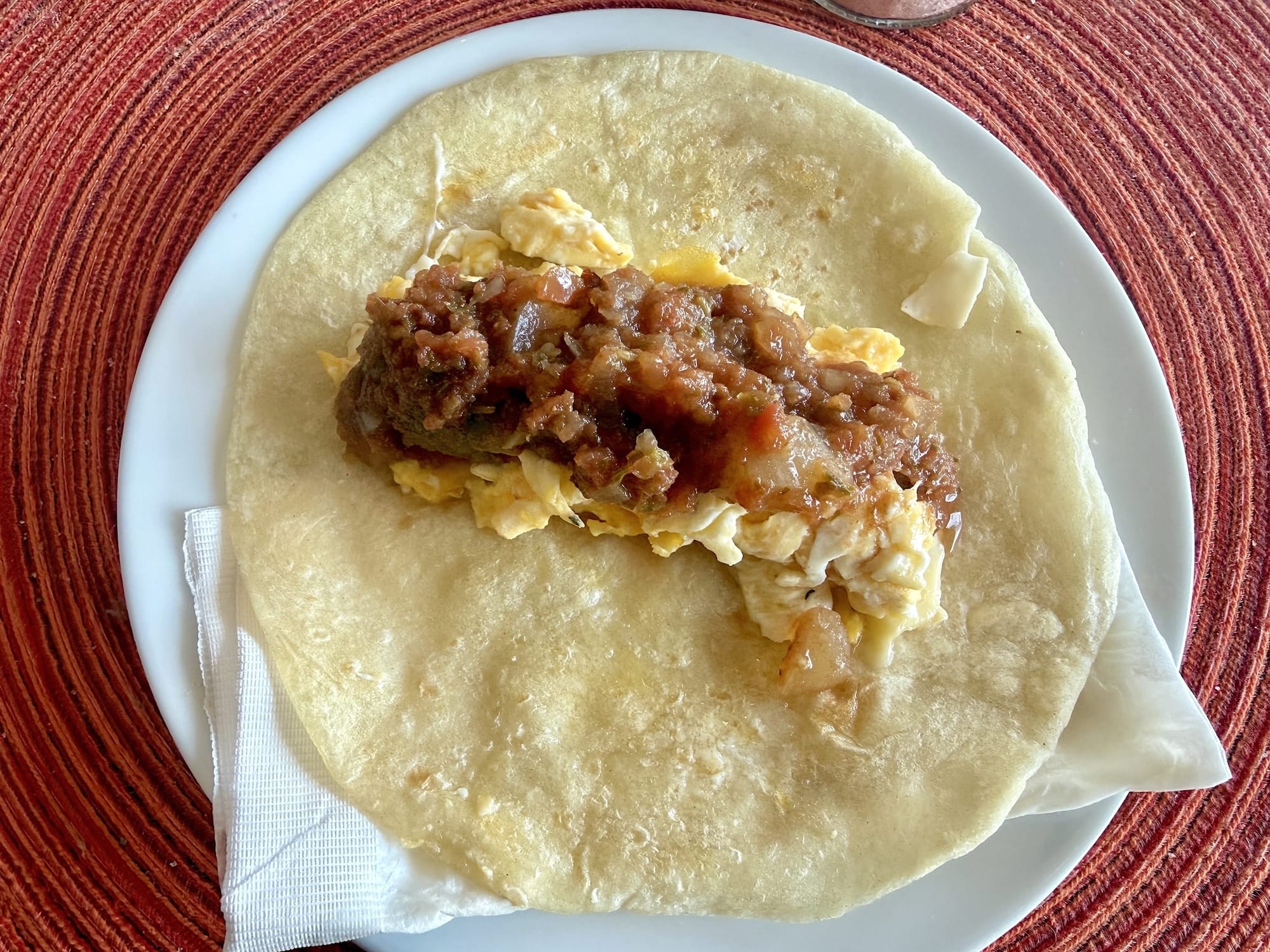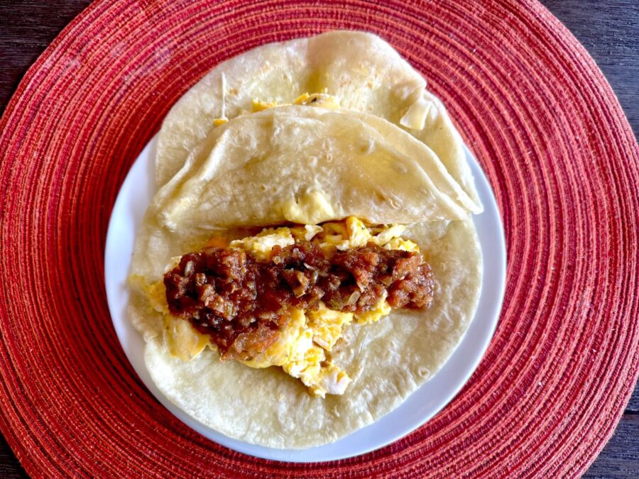 Scrambled eggs. Tortillas. Salsa.